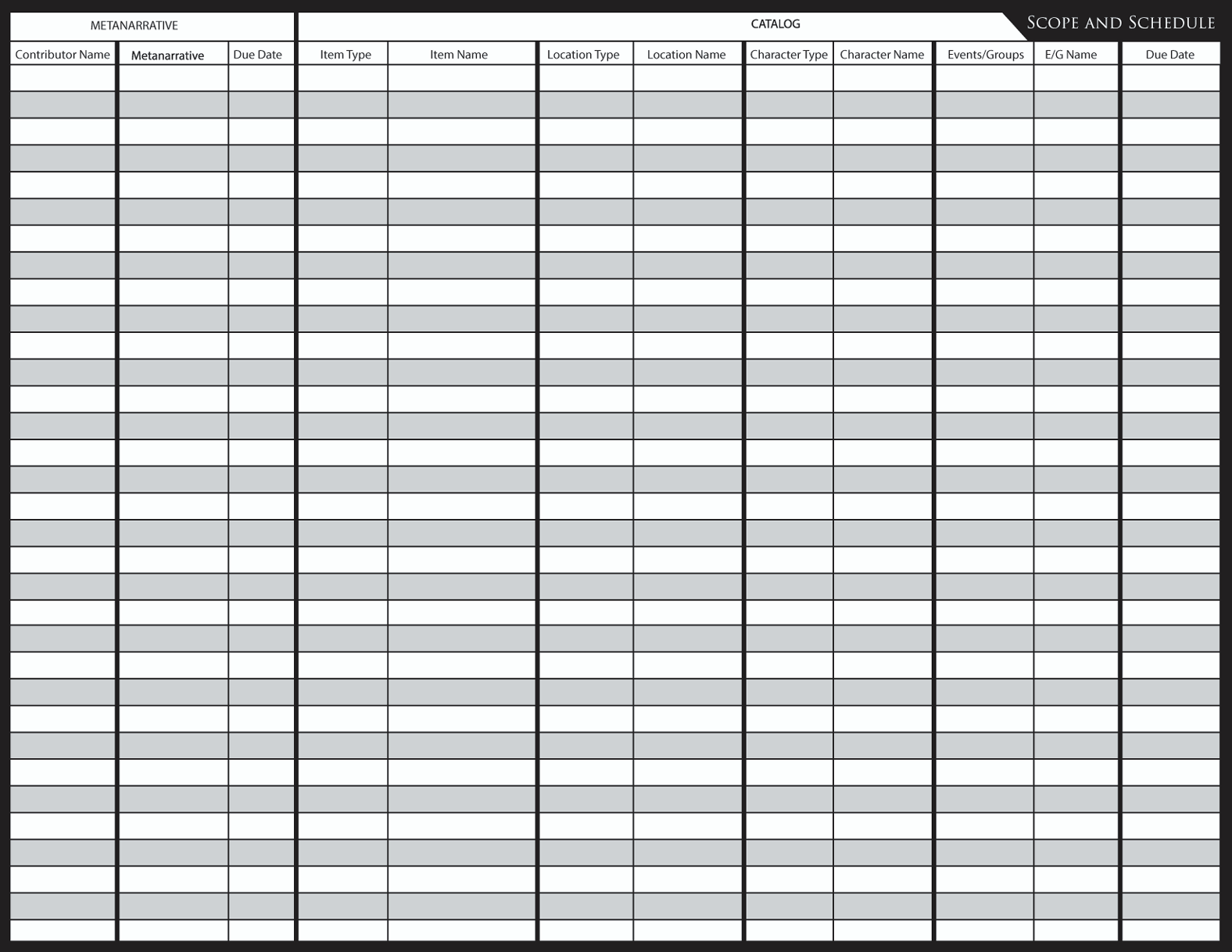 The Scope and Schedule Worksheet helps keep your worldbuilding project on track and on schedule as your transition to populating the catalog with People, Places, and Things. It’s essentially a spreadsheet used to record which contributor agreed to create which entries and the date by which the contributors agree to complete them. It also ensures that your world will have a diverse set of entries.