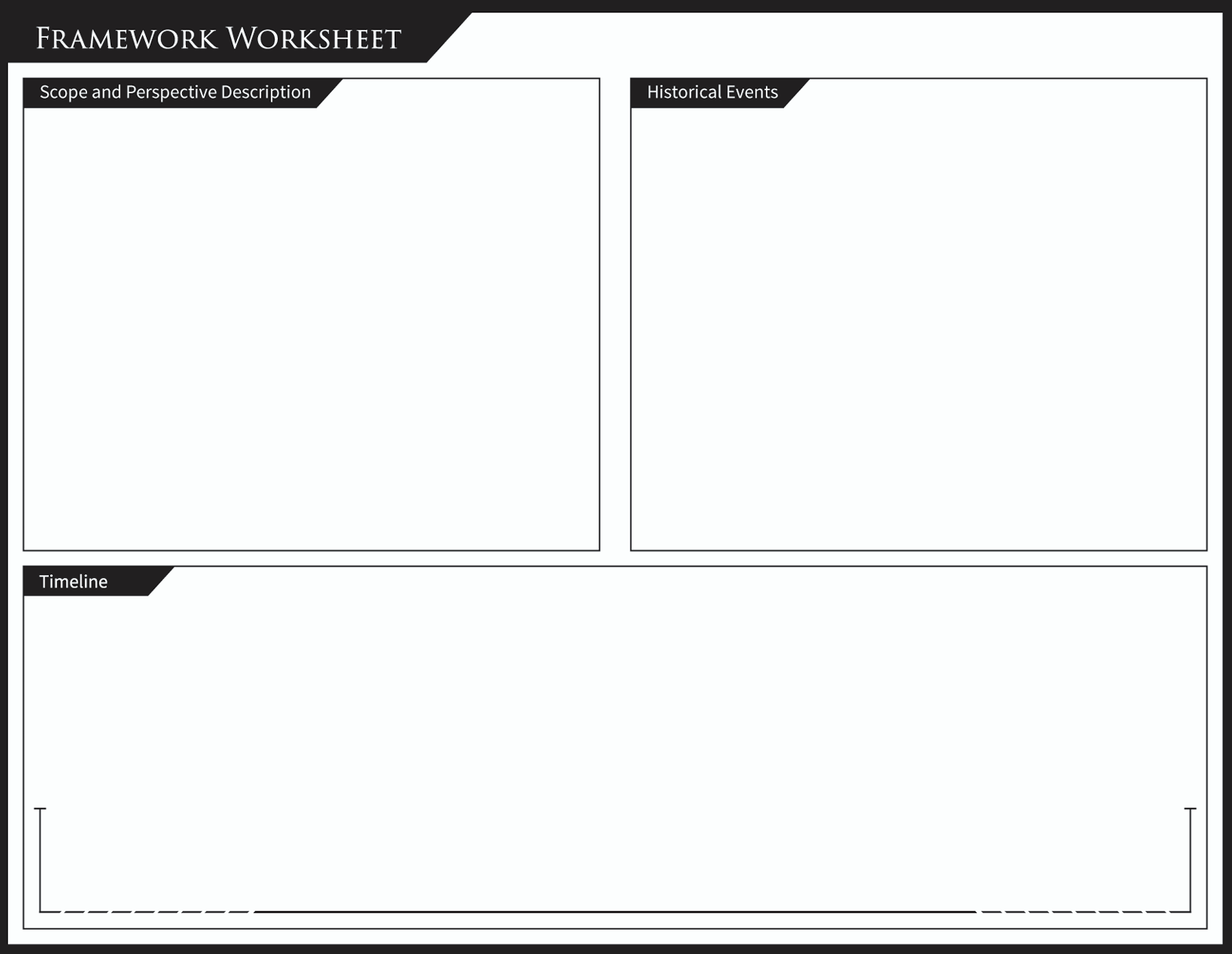 The Worldbuilding Framework Worksheet features three boxes: one for recording the world’s scope and perspective; one for writing down major historical events that shaped the world; and one for marking those historical events on a sequential timeline.