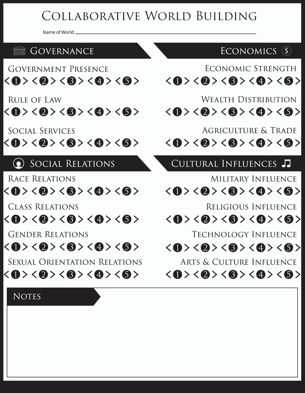 In the early stages of the worldbuilding project, it’s useful for everyone in the group to have their own copy of the structures’ numeric values and a place to jot down a flurry of notes and ideas. Transferring the values from the card deck to the worksheet also saves valuable tabletop space as you continue to work on your project.